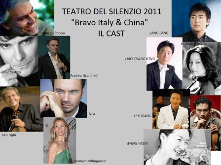 Teatro del Silenzio 2011 "Bravo Italy & China" per l'ITALIA: ANDREA BOCELLI, RENATO ZERO, UTO UGHI, ANDREA GRIMINELLI, NEK, ELEONORA ABBAGNATO per la CINA: LANG LANG, HUANG YING, LIAO CHANGYONG, LV SIQING, LI YUGANG, WANG YABIN |